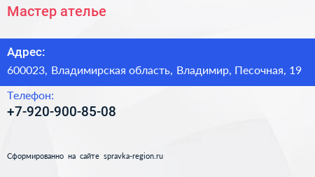 Мастер, ателье по адресу 600023, Владимирская область, Владимир, Песочная, 19 в дальнейшем Организация, размещена в следующих категориях:
