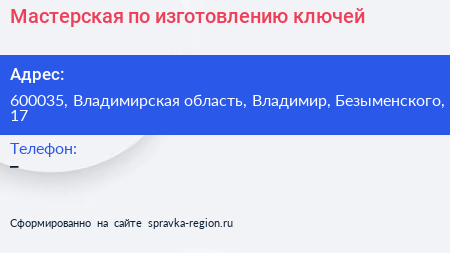 Мастерская по изготовлению ключей по адресу 600035, Владимирская область, Владимир, Безыменского, 17 в дальнейшем Организация, размещена в следующих категориях: