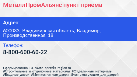 МеталлПромАльянс, пункт приема по адресу 600033, Владимирская область, Владимир, Производственная, 18 в дальнейшем Организация, размещена в следующих категориях: