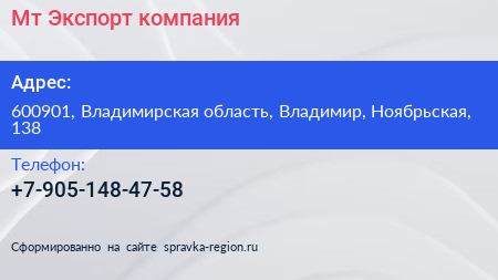 Мт-Экспорт, компания по адресу 600901, Владимирская область, Владимир, Ноябрьская, 138 в дальнейшем Организация, размещена в следующих категориях: