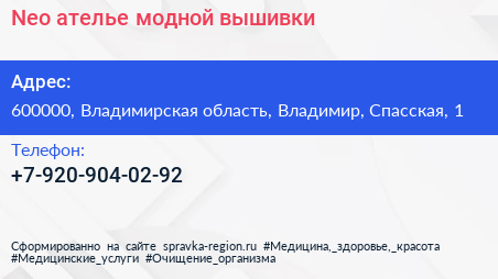 Neo, ателье модной вышивки по адресу 600000, Владимирская область, Владимир, Спасская, 1 в дальнейшем Организация, размещена в следующих категориях: