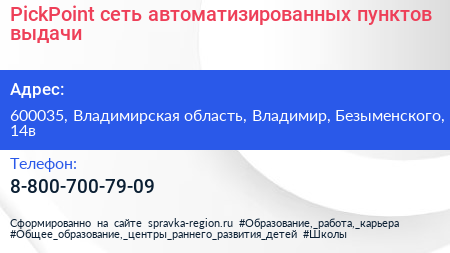 PickPoint, сеть автоматизированных пунктов выдачи по адресу 600035, Владимирская область, Владимир, Безыменского, 14в в дальнейшем Организация, размещена в следующих категориях: