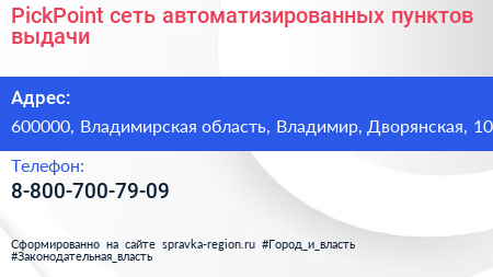 PickPoint, сеть автоматизированных пунктов выдачи по адресу 600000, Владимирская область, Владимир, Дворянская, 10 в дальнейшем Организация, размещена в следующих категориях: