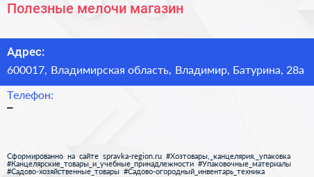 Полезные мелочи, магазин по адресу 600017, Владимирская область, Владимир, Батурина, 28а в дальнейшем Организация, размещена в следующих категориях: