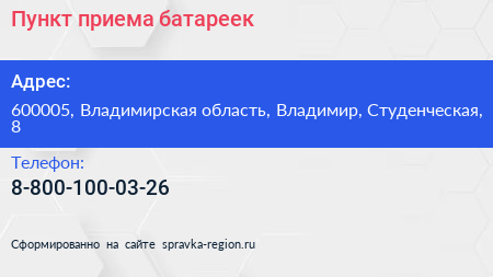 Пункт приема батареек по адресу 600005, Владимирская область, Владимир, Студенческая, 8 в дальнейшем Организация, размещена в следующих категориях: