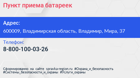 Пункт приема батареек по адресу 600009, Владимирская область, Владимир, Мира, 37 в дальнейшем Организация, размещена в следующих категориях: