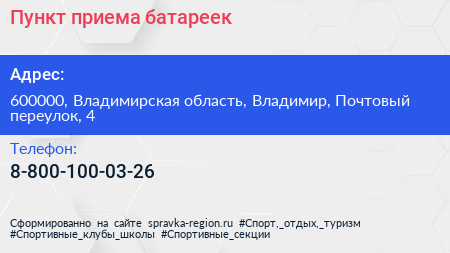 Пункт приема батареек по адресу 600000, Владимирская область, Владимир, Почтовый переулок, 4 в дальнейшем Организация, размещена в следующих категориях: