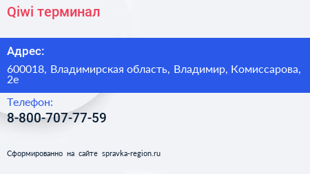 Qiwi, терминал по адресу 600018, Владимирская область, Владимир, Комиссарова, 2е в дальнейшем Организация, размещена в следующих категориях: