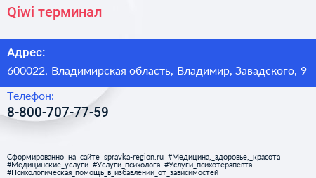 Qiwi, терминал по адресу 600022, Владимирская область, Владимир, Завадского, 9 в дальнейшем Организация, размещена в следующих категориях: