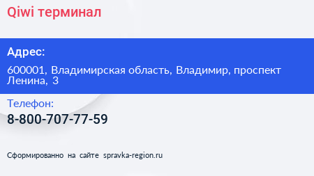 Qiwi, терминал по адресу 600001, Владимирская область, Владимир, проспект Ленина, 3 в дальнейшем Организация, размещена в следующих категориях: