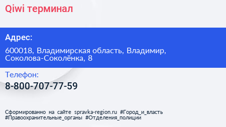 Qiwi, терминал по адресу 600018, Владимирская область, Владимир, Соколова-Соколёнка, 8 в дальнейшем Организация, размещена в следующих категориях: