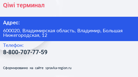 Qiwi, терминал по адресу 600020, Владимирская область, Владимир, Большая Нижегородская, 12 в дальнейшем Организация, размещена в следующих категориях: