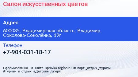 Салон искусственных цветов по адресу 600035, Владимирская область, Владимир, Соколова-Соколёнка, 19г в дальнейшем Организация, размещена в следующих категориях: