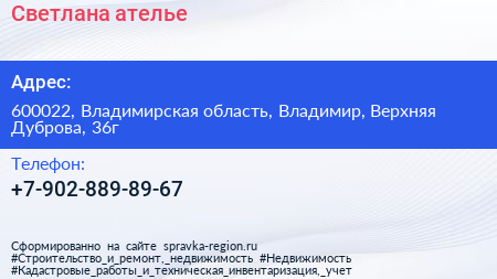 Светлана, ателье по адресу 600022, Владимирская область, Владимир, Верхняя Дуброва, 36г в дальнейшем Организация, размещена в следующих категориях: