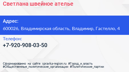 Светлана, швейное ателье по адресу 600026, Владимирская область, Владимир, Гастелло, 4 в дальнейшем Организация, размещена в следующих категориях: