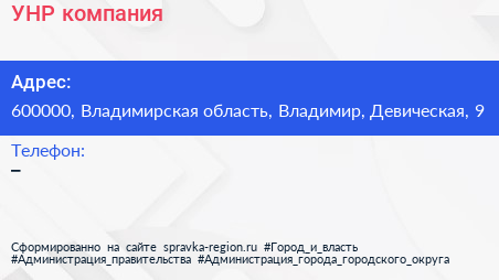 УНР, компания по адресу 600000, Владимирская область, Владимир, Девическая, 9 в дальнейшем Организация, размещена в следующих категориях: