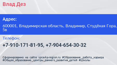 Влад Дез по адресу 600001, Владимирская область, Владимир, Студёная Гора, 5в в дальнейшем Организация, размещена в следующих категориях: