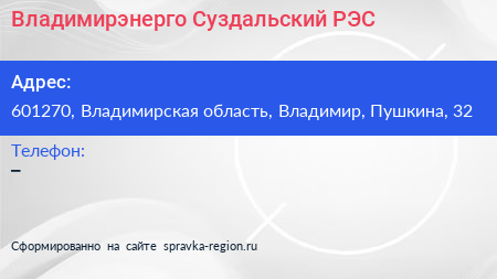 Владимирэнерго, Суздальский РЭС по адресу 601270, Владимирская область, Владимир, Пушкина, 32 в дальнейшем Организация, размещена в следующих категориях: