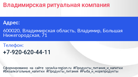 Владимирская ритуальная компания по адресу 600020, Владимирская область, Владимир, Большая Нижегородская, 71 в дальнейшем Организация, размещена в следующих категориях: