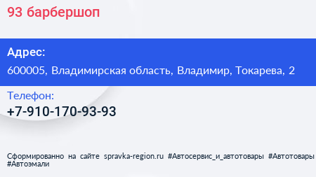 93, барбершоп по адресу 600005, Владимирская область, Владимир, Токарева, 2 в дальнейшем Организация, размещена в следующих категориях:
