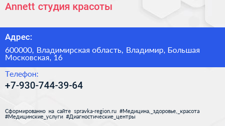 Annett, студия красоты по адресу 600000, Владимирская область, Владимир, Большая Московская, 16 в дальнейшем Организация, размещена в следующих категориях: