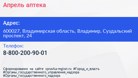 Апрель, аптека по адресу 600027, Владимирская область, Владимир, Суздальский проспект, 24 в дальнейшем Организация, размещена в следующих категориях: