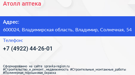 Атолл, аптека по адресу 600024, Владимирская область, Владимир, Солнечная, 54 в дальнейшем Организация, размещена в следующих категориях:
