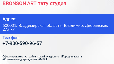 BRONSON ART, тату-студия по адресу 600001, Владимирская область, Владимир, Дворянская, 27а к7 в дальнейшем Организация, размещена в следующих категориях: