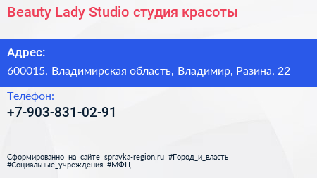 Beauty Lady Studio, студия красоты по адресу 600015, Владимирская область, Владимир, Разина, 22 в дальнейшем Организация, размещена в следующих категориях: