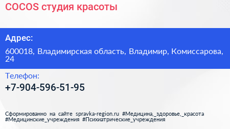 COCOS, студия красоты по адресу 600018, Владимирская область, Владимир, Комиссарова, 24 в дальнейшем Организация, размещена в следующих категориях: