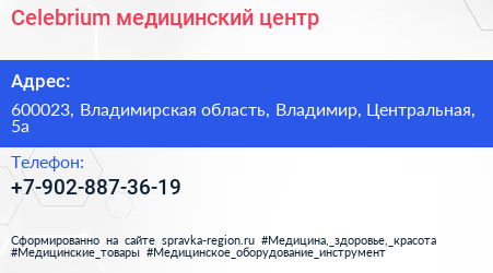 Celebrium, медицинский центр по адресу 600023, Владимирская область, Владимир, Центральная, 5а в дальнейшем Организация, размещена в следующих категориях: