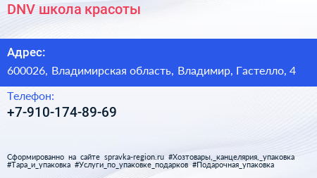 DNV, школа красоты по адресу 600026, Владимирская область, Владимир, Гастелло, 4 в дальнейшем Организация, размещена в следующих категориях: