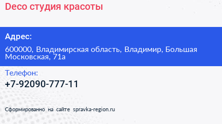 Deco, студия красоты по адресу 600000, Владимирская область, Владимир, Большая Московская, 71а в дальнейшем Организация, размещена в следующих категориях: