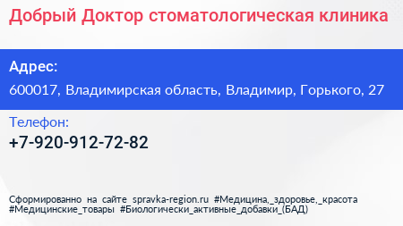 Добрый Доктор, стоматологическая клиника по адресу 600017, Владимирская область, Владимир, Горького, 27 в дальнейшем Организация, размещена в следующих категориях: