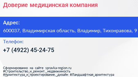 Доверие, медицинская компания по адресу 600037, Владимирская область, Владимир, Тихонравова, 9 в дальнейшем Организация, размещена в следующих категориях: