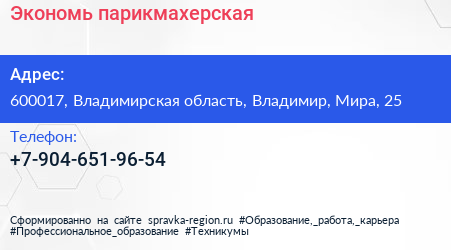 Экономь, парикмахерская по адресу 600017, Владимирская область, Владимир, Мира, 25 в дальнейшем Организация, размещена в следующих категориях: