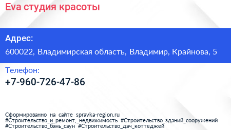 Eva, студия красоты по адресу 600022, Владимирская область, Владимир, Крайнова, 5 в дальнейшем Организация, размещена в следующих категориях: