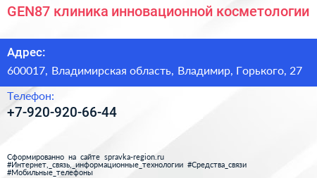 GEN87, клиника инновационной косметологии по адресу 600017, Владимирская область, Владимир, Горького, 27 в дальнейшем Организация, размещена в следующих категориях: