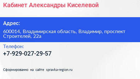 Кабинет Александры Киселевой по адресу 600014, Владимирская область, Владимир, проспект Строителей, 22а в дальнейшем Организация, размещена в следующих категориях: