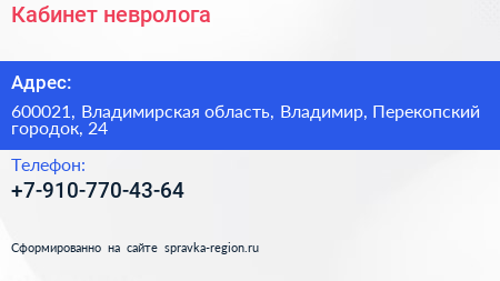 Кабинет невролога по адресу 600021, Владимирская область, Владимир, Перекопский городок, 24 в дальнейшем Организация, размещена в следующих категориях: