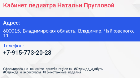 Кабинет педиатра Натальи Пругловой по адресу 600015, Владимирская область, Владимир, Чайковского, 11 в дальнейшем Организация, размещена в следующих категориях: