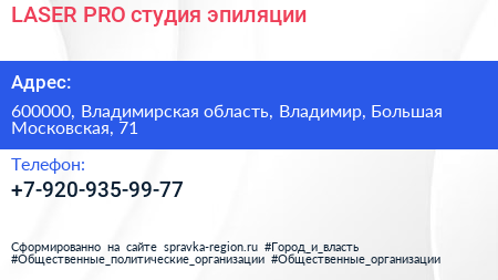 LASER PRO, студия эпиляции по адресу 600000, Владимирская область, Владимир, Большая Московская, 71 в дальнейшем Организация, размещена в следующих категориях: