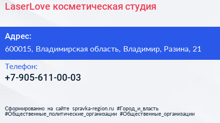 LaserLove, косметическая студия по адресу 600015, Владимирская область, Владимир, Разина, 21 в дальнейшем Организация, размещена в следующих категориях: