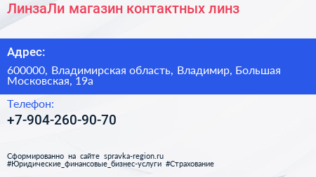 ЛинзаЛи, магазин контактных линз по адресу 600000, Владимирская область, Владимир, Большая Московская, 19а в дальнейшем Организация, размещена в следующих категориях: