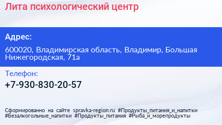 Лита, психологический центр по адресу 600020, Владимирская область, Владимир, Большая Нижегородская, 71а в дальнейшем Организация, размещена в следующих категориях: