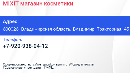MIXIT, магазин косметики по адресу 600026, Владимирская область, Владимир, Тракторная, 45 в дальнейшем Организация, размещена в следующих категориях: