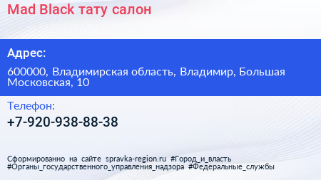 Mad Black, тату-салон по адресу 600000, Владимирская область, Владимир, Большая Московская, 10 в дальнейшем Организация, размещена в следующих категориях: