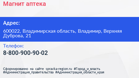 Магнит, аптека по адресу 600022, Владимирская область, Владимир, Верхняя Дуброва, 21 в дальнейшем Организация, размещена в следующих категориях:
