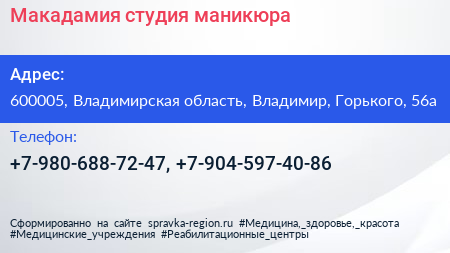 Макадамия, студия маникюра по адресу 600005, Владимирская область, Владимир, Горького, 56а в дальнейшем Организация, размещена в следующих категориях: