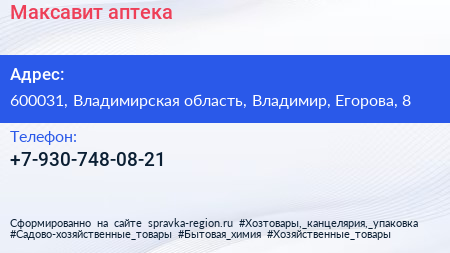 Максавит, аптека по адресу 600031, Владимирская область, Владимир, Егорова, 8 в дальнейшем Организация, размещена в следующих категориях: